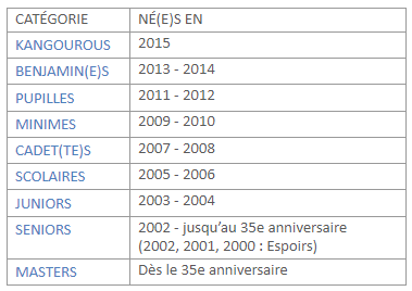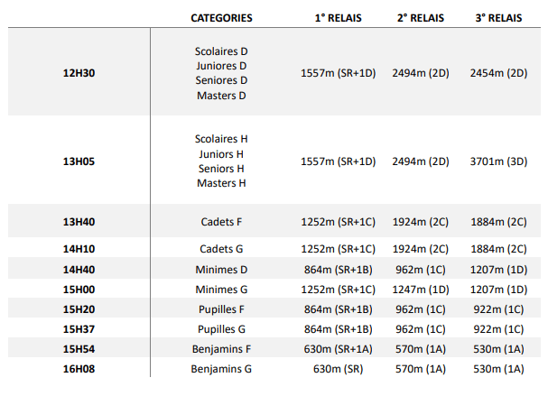 Si vous êtes intéressé(e)s, parlez-en avec votre entraîneur et contactez-nous pour faire les équipes de 3 personnes… Contrairement aux cross, les catégories ne sont pas coupées par année de naissance (par exemple, des pupilles de 2011 et de 2012 peuvent faire partie de la même équipe).
