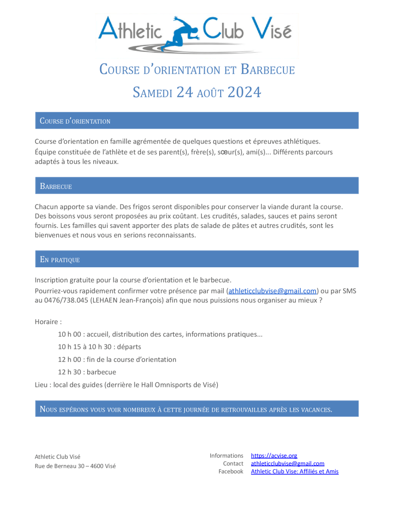 L’entraînement sera remplacé par une course d’orientation (parents + enfants) agrémentée de quelques questions et épreuves athlétiques préparées par les entraîneurs et suivie d’un barbecue.